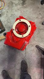 Moteur tout nettoyé, goujons cassés extraits, tout repeint et remonté sur la boite. Joint papier neuf évidemment comme tous les autres, vive la découpe laser! Il n'y a pas de joint spi sur l'arbre moteur, l'huile est libre de passer autour, après un deflecteur la redirige vers la périphérie du carter pour ne pas qu'elle aille dans le moteur itself, puis elle retombe par gravité dans la boite via une lumière visible en bas.