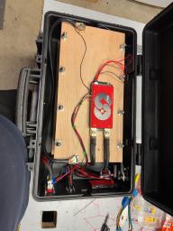 La batterie est assemblée est dans sa valise et fonctionne très bien (le contreplaqué sera remplacé par des plaques alu que je récupère demain), la prochaine étape c'est la fabrication du flotteur défintif...
